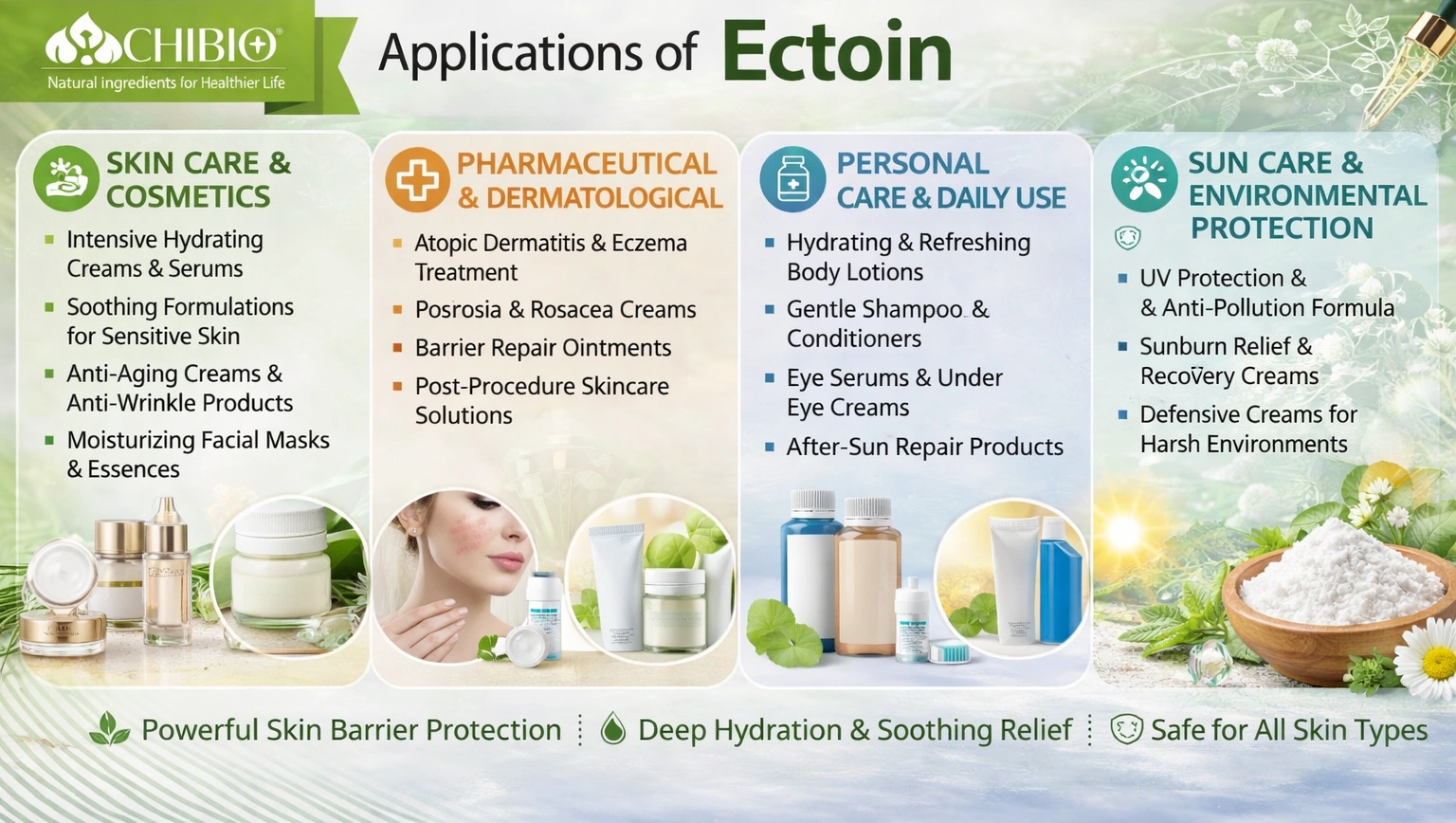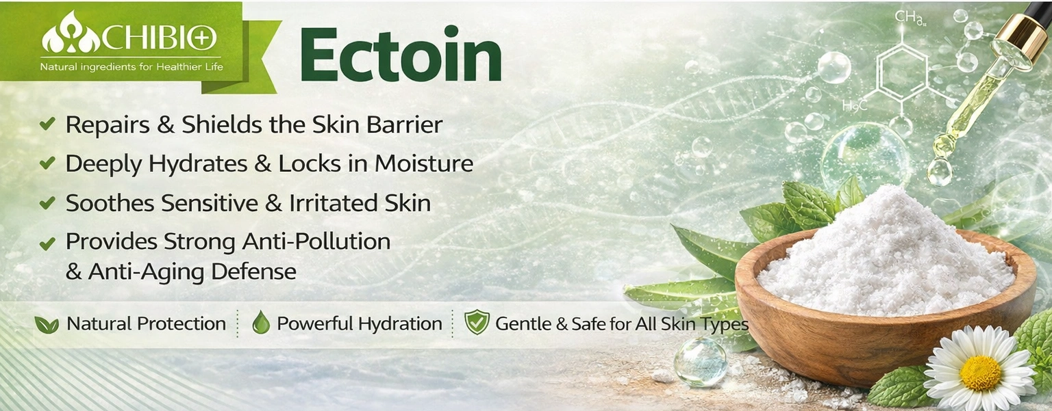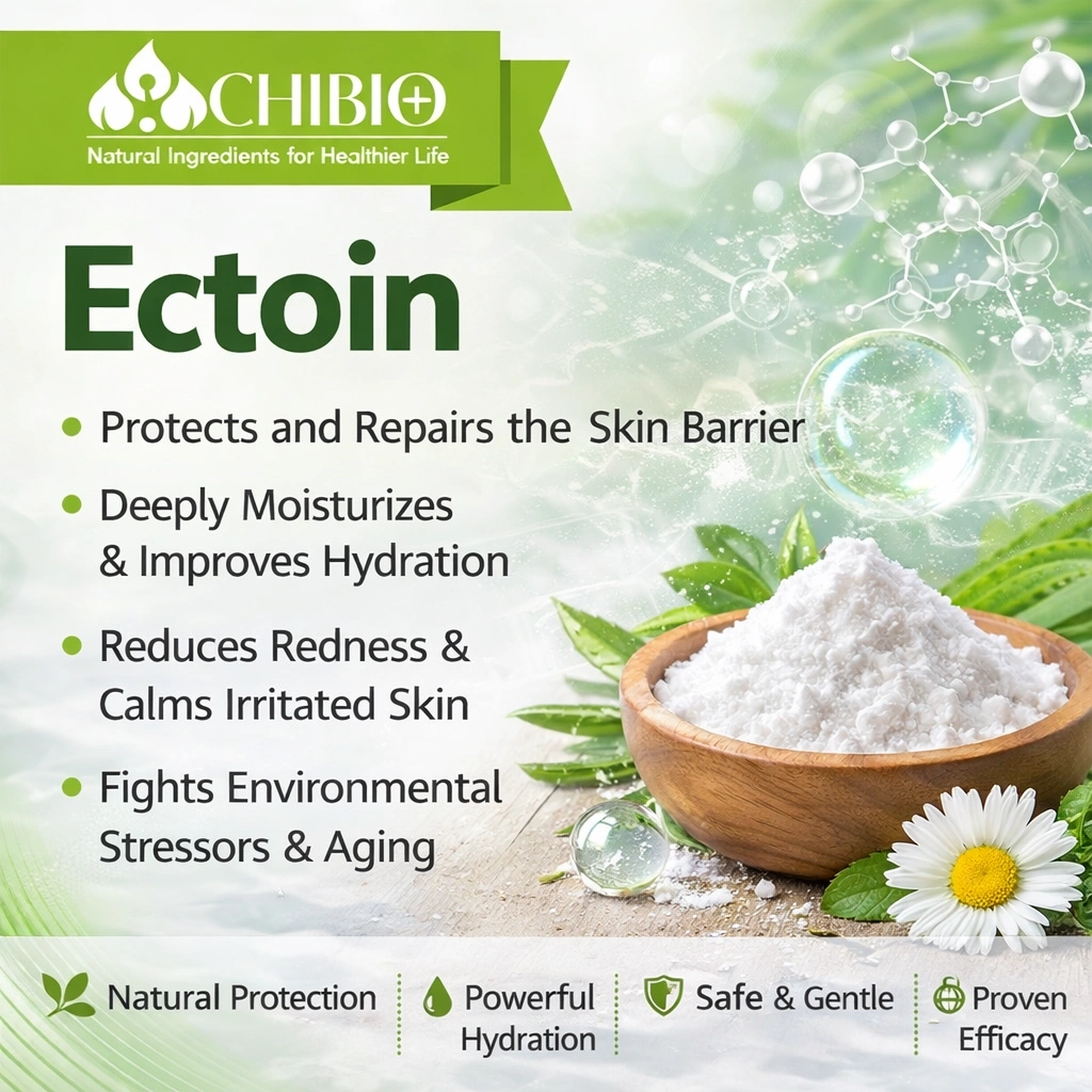 Chibio Biotech supplies high-purity cosmetic grade Ectoin (≥99.9%) for premium skincare and dermocosmetic applications.