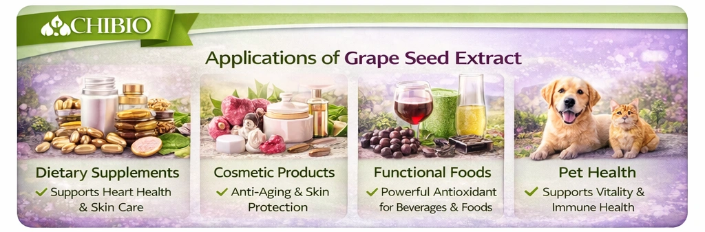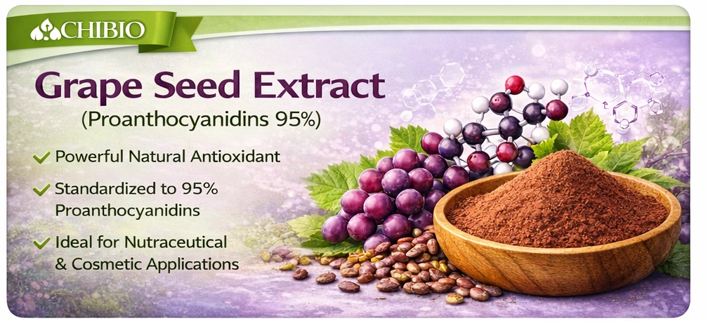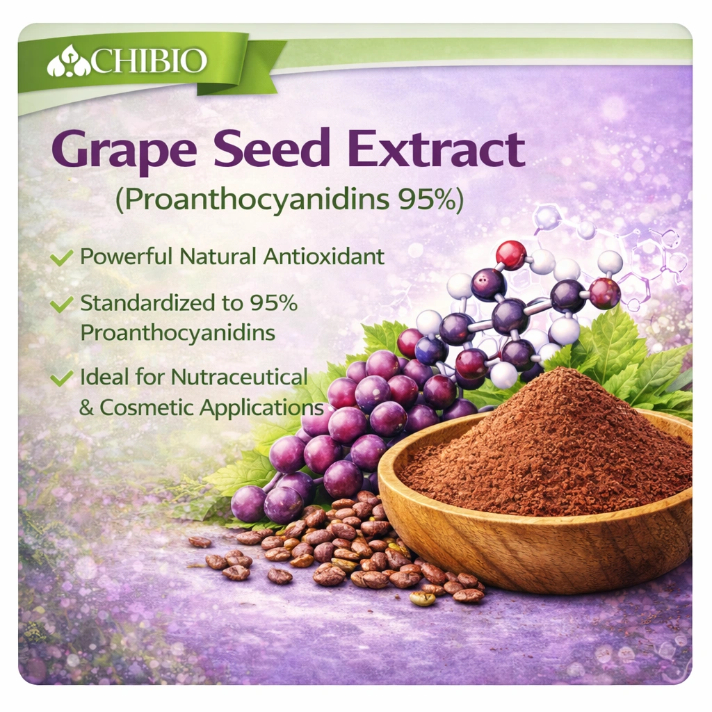 Chibio Biotech supplies high-purity Grape Seed Extract standardized to Proanthocyanidins ≥95%, with strict heavy metal and microbiological control for safe use in dietary supplements, functional foods, and cosmetic applications.