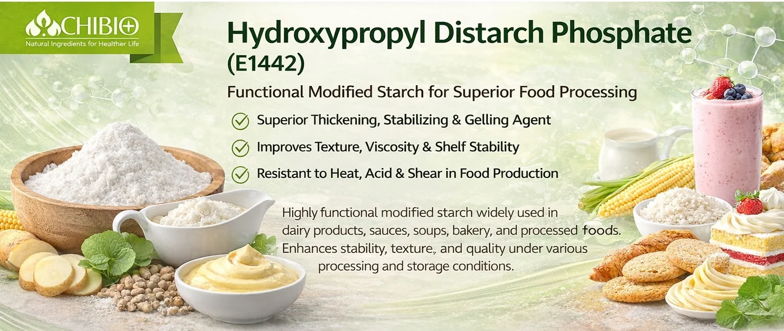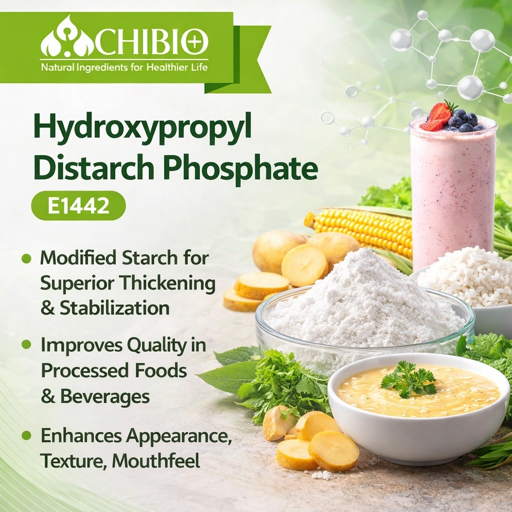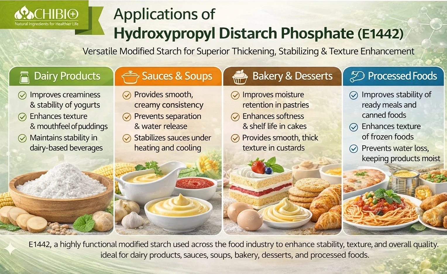Chibio Biotech supplies Food Grade E1442 derived from high-quality cassava starch, compliant with GB 29931-2013 standards . It is widely used in sauces, frozen foods, dairy products, and processed meals requiring stable viscosity and texture performance.