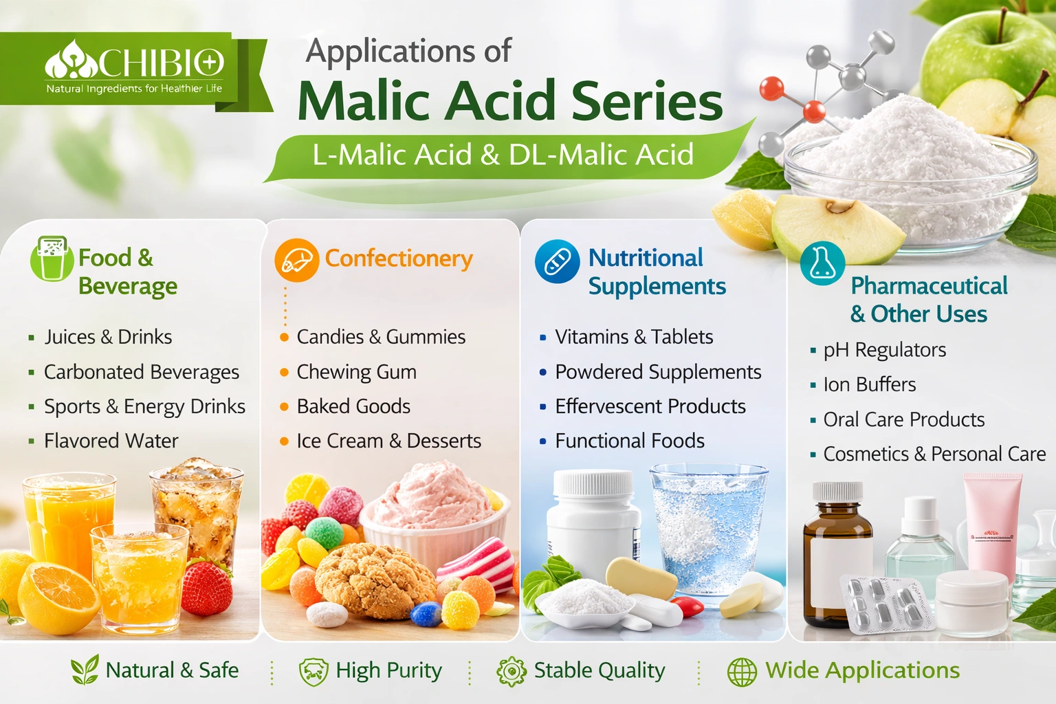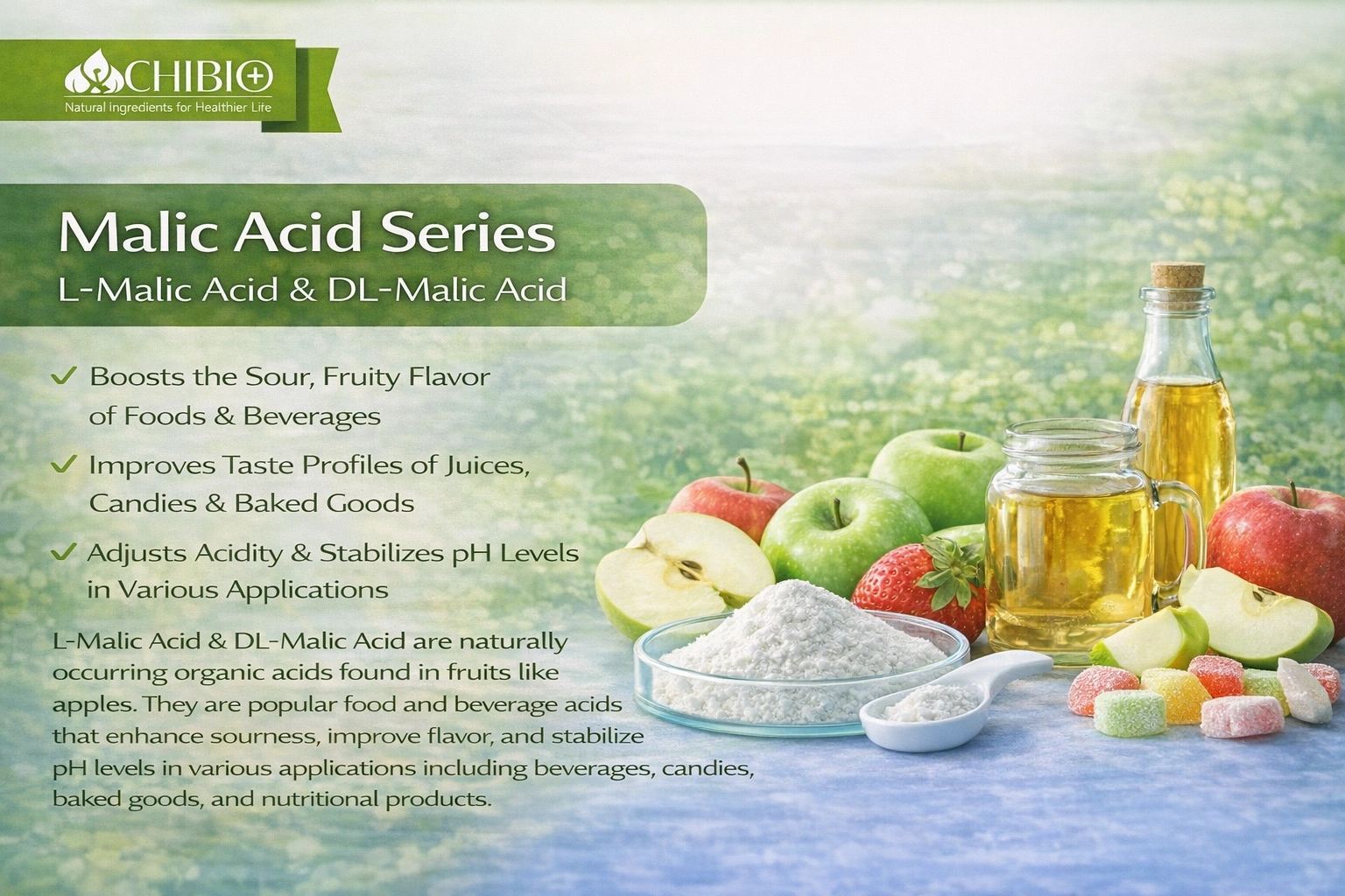 Chibio’s Malic Acid Series (L-Malic Acid & DL-Malic Acid) provides high-purity acidity regulators suitable for beverages, confectionery, pharmaceuticals, and functional nutrition products. With distinct advantages in flavor performance and application flexibility, these products help manufacturers optimize taste, stability, and formulation efficiency.