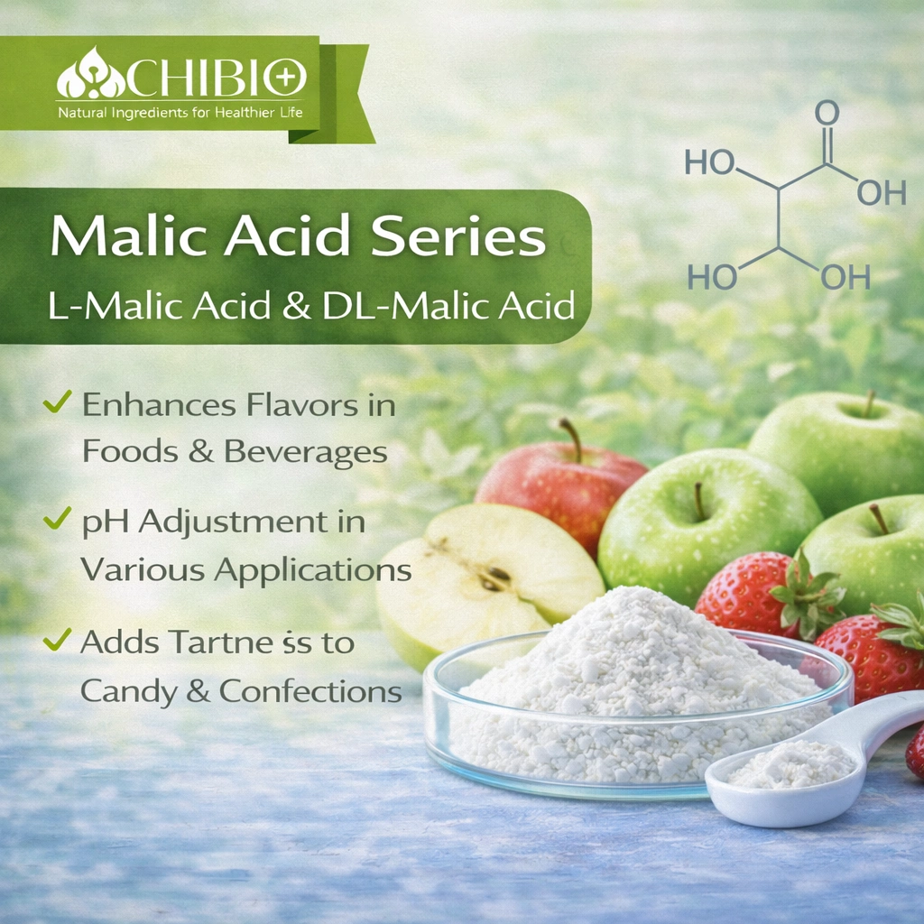 Chibio’s Malic Acid Series (L-Malic Acid & DL-Malic Acid) provides high-purity acidity regulators suitable for beverages, confectionery, pharmaceuticals, and functional nutrition products. With distinct advantages in flavor performance and application flexibility, these products help manufacturers optimize taste, stability, and formulation efficiency.