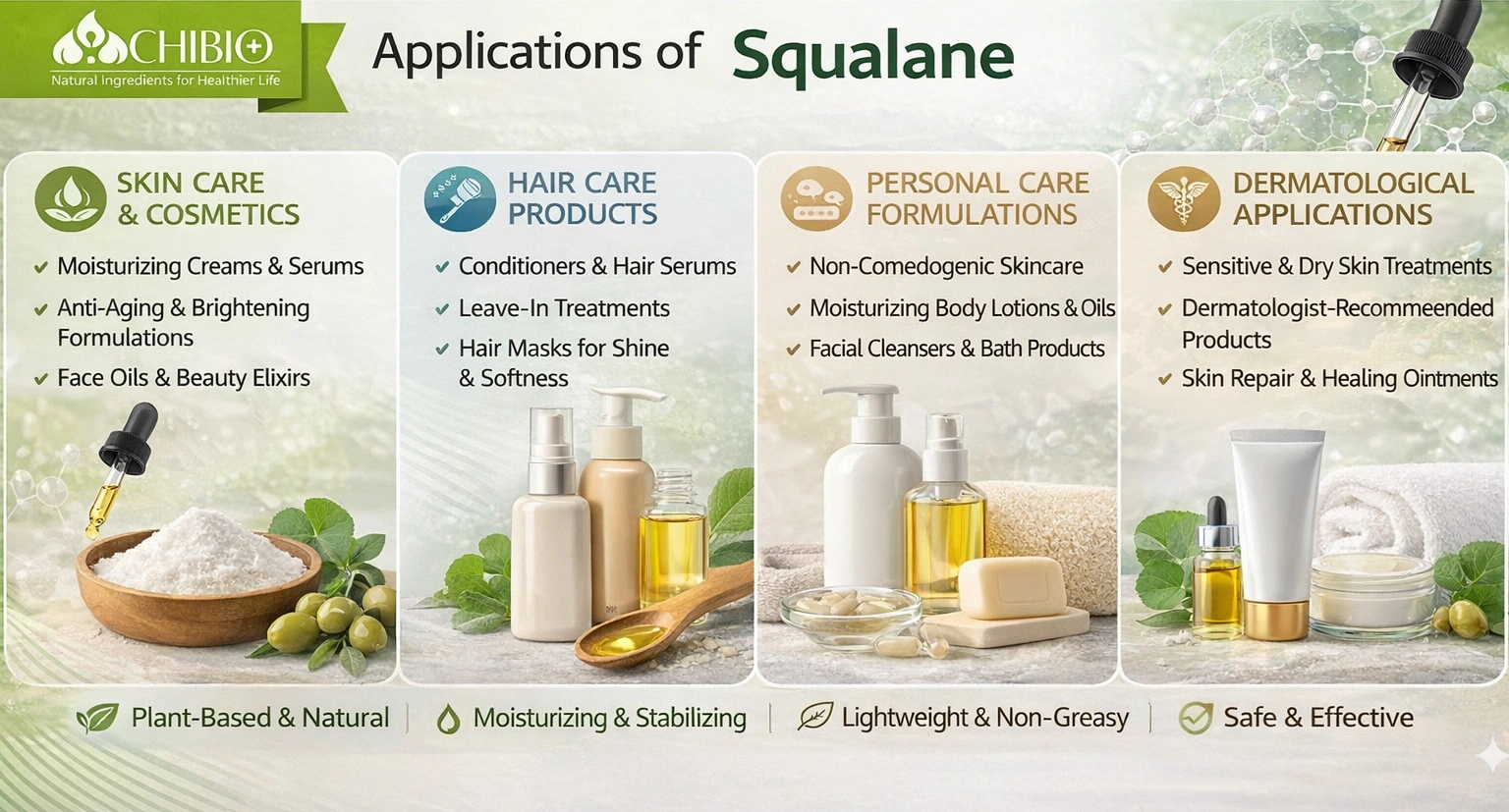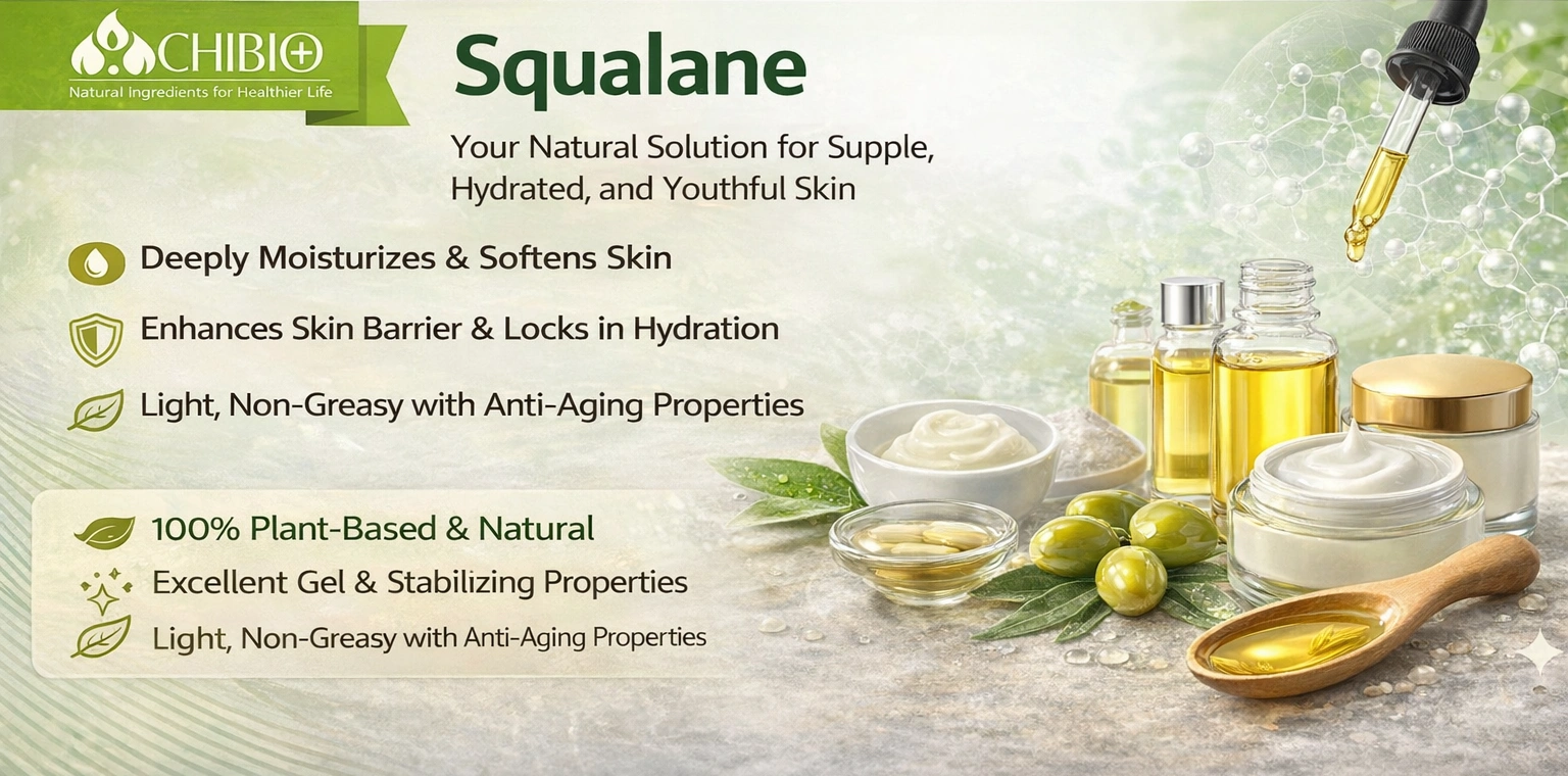 Chibio Biotech supplies ≥99% pure, food-grade, plant-based Squalane for safe and effective moisturizing in a wide range of cosmetic applications.